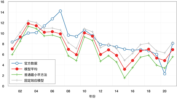 我们建立了一个简单的模型以提供一组对照数据2。模型主要采用三个重要变量:能源消费/电力生产的年成长率、二氧化碳排放量以及总贸易量(出口加进口)。为了校准,我们也纳入了世界前13大经济体的数据。欲知更多详情可参考附录。
